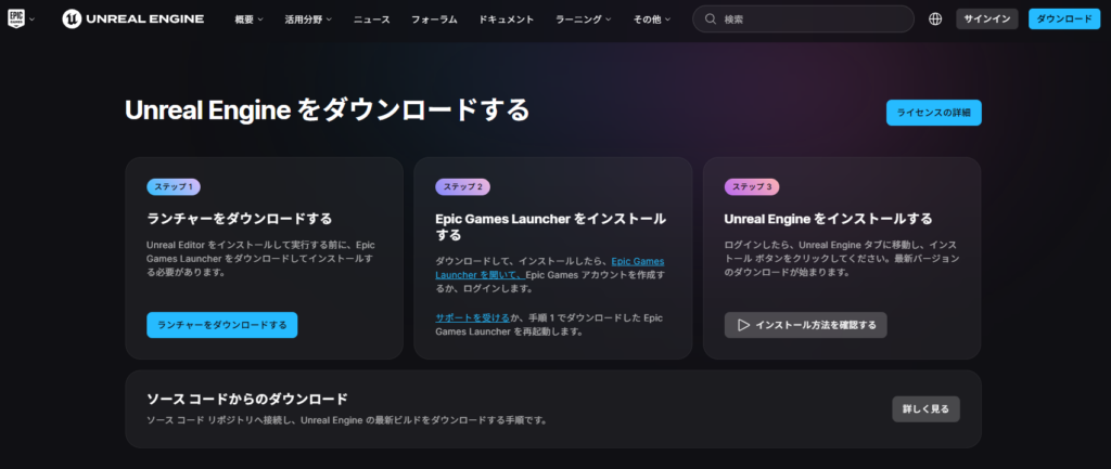 ステップ1にある、「ランチャーをダウンロードする」を選択します。ゲームエンジンのインストールはこのランチャーから行います。