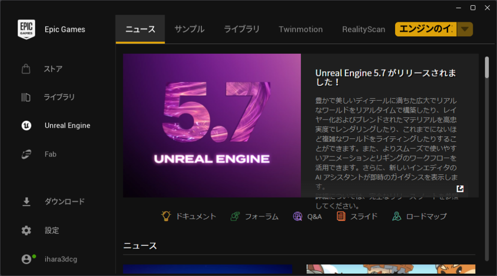 Unreal Engine 5をインストールするには、まずEpic Games Launcherというアプリが必要になります。これを知らなくて最初ちょっと詰まりました。「UE5を直接ダウンロードするボタンはないの?」って思ったんですが、Launcherを経由する仕組みになっているんですね。