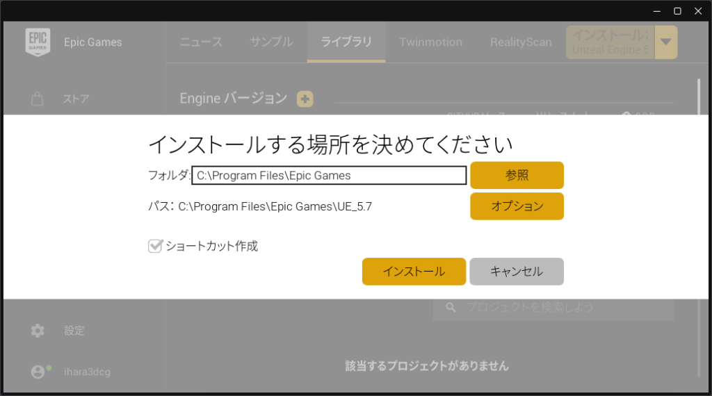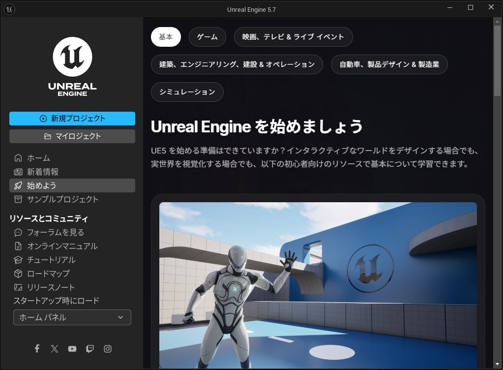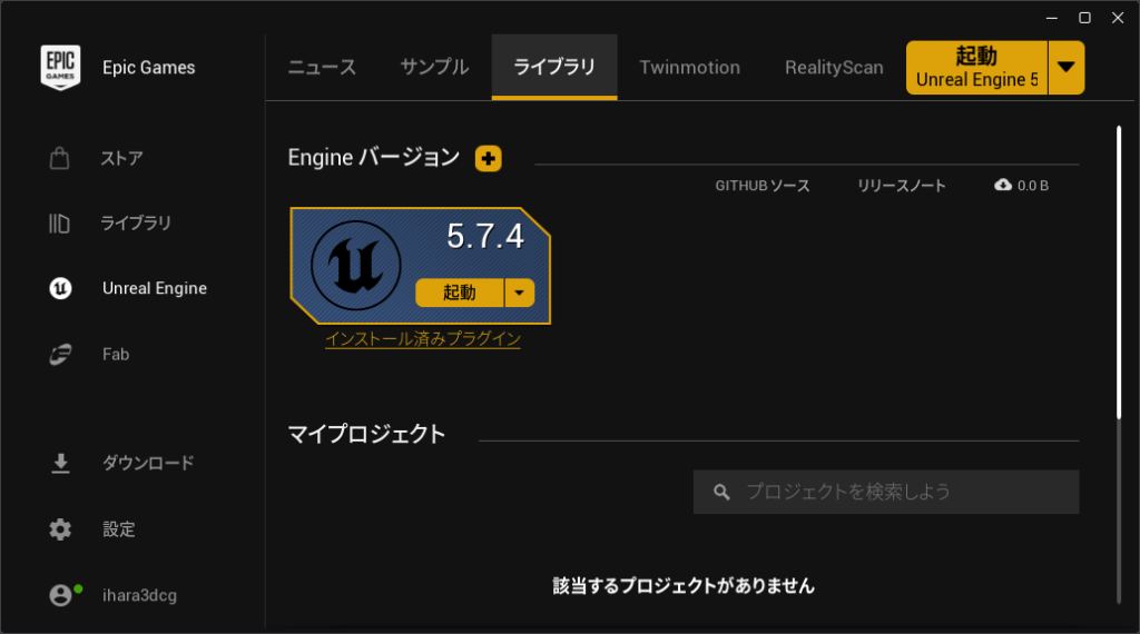 インストールが完了したら、実際にUnreal Engine 5が起動するか確認してましょう。