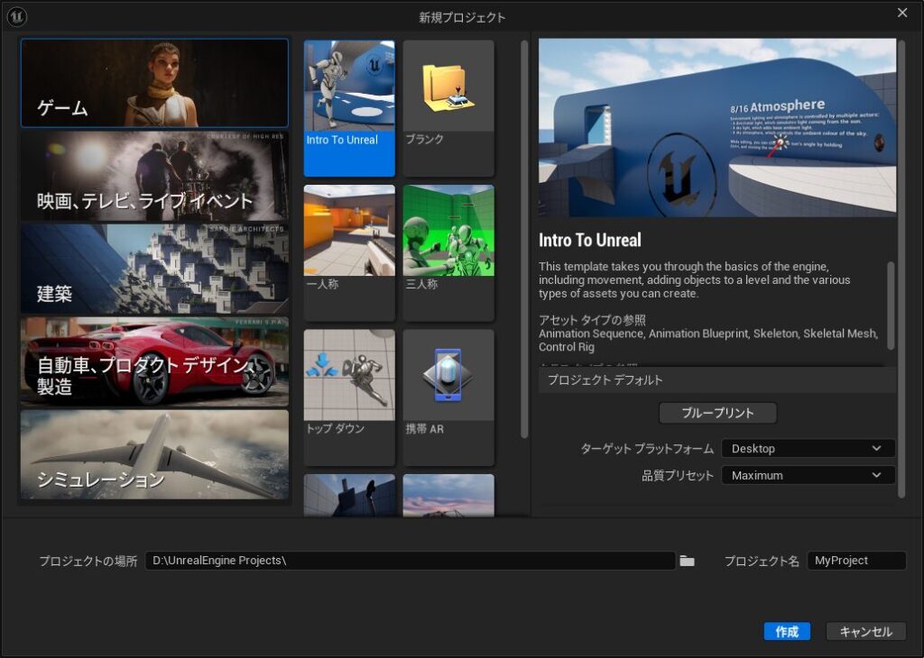 特に設定は変更せず、プロジェクトの作成場所を確認し、「作成」ボタンを押します。